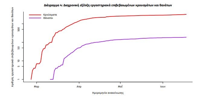 Η διαχρονική εξέλιξη των συνολικών κρουσμάτων και συνολικού αριθμού των θανάτων ασθενών COVID-19 παρουσιάζεται στο ακόλουθο διάγραμμα (σε λογαριθμική κλίμακα).