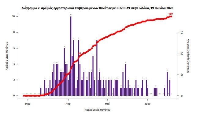 Οι νέοι θάνατοι ασθενών με COVID-19 είναι 1, ενώ από την έναρξη της επιδημίας έχουν καταγραφεί συνολικά 189 θάνατοι. Η μέση ηλικία των ασθενών που απεβίωσαν είναι 76 έτη.