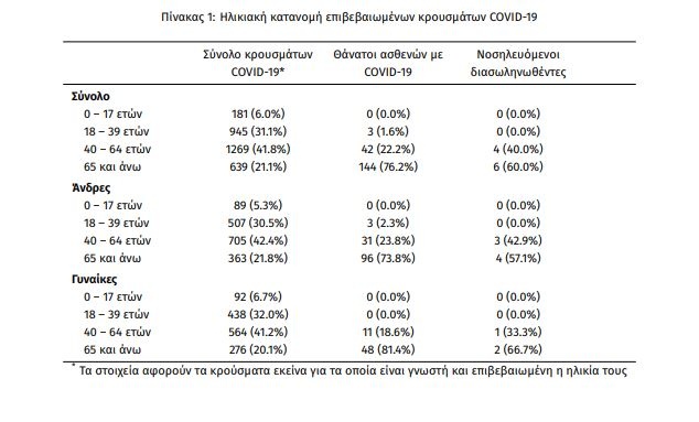 Η μέση ηλικία των κρουσμάτων είναι 48 έτη (εύρος 0 έως 102 ετών), ενώ η μέση ηλικία των θανάτων είναι 76 έτη (εύρος 35 έως 102 ετών). Η ηλικιακή κατανομή των (α) συνολικών κρουσμάτων, (β) των περιστατικών που κατέληξαν σε θάνατο και (γ) των ασθενών που νοσηλεύονται διασωληνωμένοι, είναι η ακόλουθη: