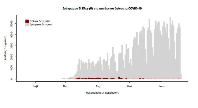 Δείγματα που έχουν ελεγχθεί στα συνεργαζόμενα με τον ΕΟΔΥ εργαστήρια: Από την 1η Ιανουαρίου 2020 μέχρι σήμερα, στα εργαστήρια που διενεργούν ελέγχους για τον νέο κορονοϊό (SARS-CoV-2) και που δηλώνουν συστηματικά στον ΕΟΔΥ το σύνολο των δειγμάτων που ελέγχουν (θετικά και αρνητικά), έχουν συνολικά ελεγχθεί 274.711 κλινικά δείγματα, εκ των οποίων τα 5.265 (1.9%) ήταν θετικά στον κορονοϊό (συμπεριλαμβάνονται και περισσότερα από ένα δείγματα ανά άτομο που ελέγχθηκε).
