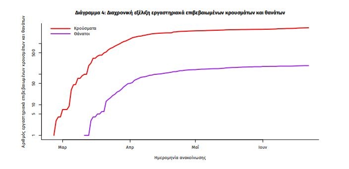 Η διαχρονική εξέλιξη των συνολικών κρουσμάτων και συνολικού αριθμού των θανάτων ασθενών COVID-19 παρουσιάζεται στο ακόλουθο διάγραμμα (σε λογαριθμική κλίμακα).