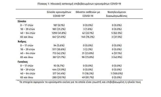 Η μέση ηλικία των κρουσμάτων είναι 47 έτη (εύρος 0 έως 102 ετών), ενώ η μέση ηλικία των θανάτων είναι 76 έτη (εύρος 35 έως 102 ετών). Η ηλικιακή κατανομή των (α) συνολικών κρουσμάτων, (β) των περιστατικών που κατέληξαν σε θάνατο και (γ) των ασθενών που νοσηλεύονται διασωληνωμένοι, είναι η ακόλουθη: