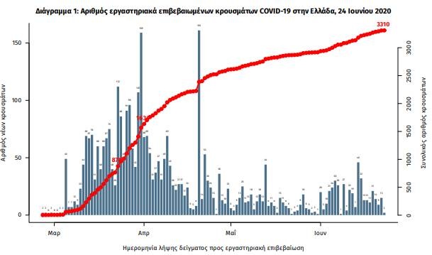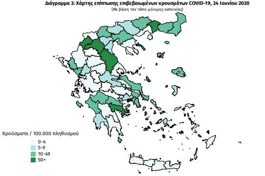 Τα στοιχεία που παρουσιάζονται παρακάτω αφορούν περιστατικά από την επιδημιολογική επιτήρηση της νόσου από το νέο κορονοϊό (COVID19), με βάση τα δεδομένα που έχουν δηλωθεί στον ΕΟΔΥ και καταγραφεί μέχρι τις 24 Ιουνίου 2020 (ώρα 15:00).