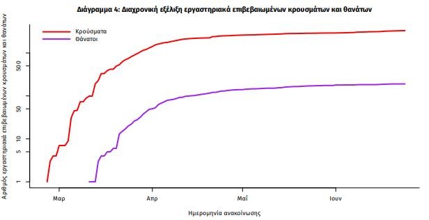 Η διαχρονική εξέλιξη των συνολικών κρουσμάτων και συνολικού αριθμού των θανάτων ασθενών COVID-19 παρουσιάζεται στο ακόλουθο διάγραμμα (σε λογαριθμική κλίμακα).