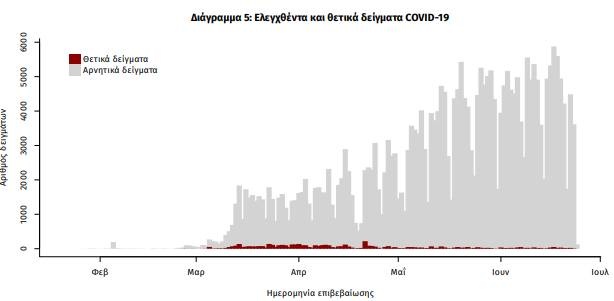Δείγματα που έχουν ελεγχθεί στα συνεργαζόμενα με τον ΕΟΔΥ εργαστήρια: Από την 1η Ιανουαρίου 2020 μέχρι σήμερα, στα εργαστήρια που διενεργούν ελέγχους για τον νέο κορωνοϊό (SARS-CoV-2) και που δηλώνουν συστηματικά στον ΕΟΔΥ το σύνολο των δειγμάτων που ελέγχουν (θετικά και αρνητικά), έχουν συνολικά ελεγχθεί 291187 κλινικά δείγματα, εκ των οποίων τα 5353 (1.8%) ήταν θετικά στον κορωνοϊό (συμπεριλαμβάνονται και περισσότερα από ένα δείγματα ανά άτομο που ελέγχθηκε).
