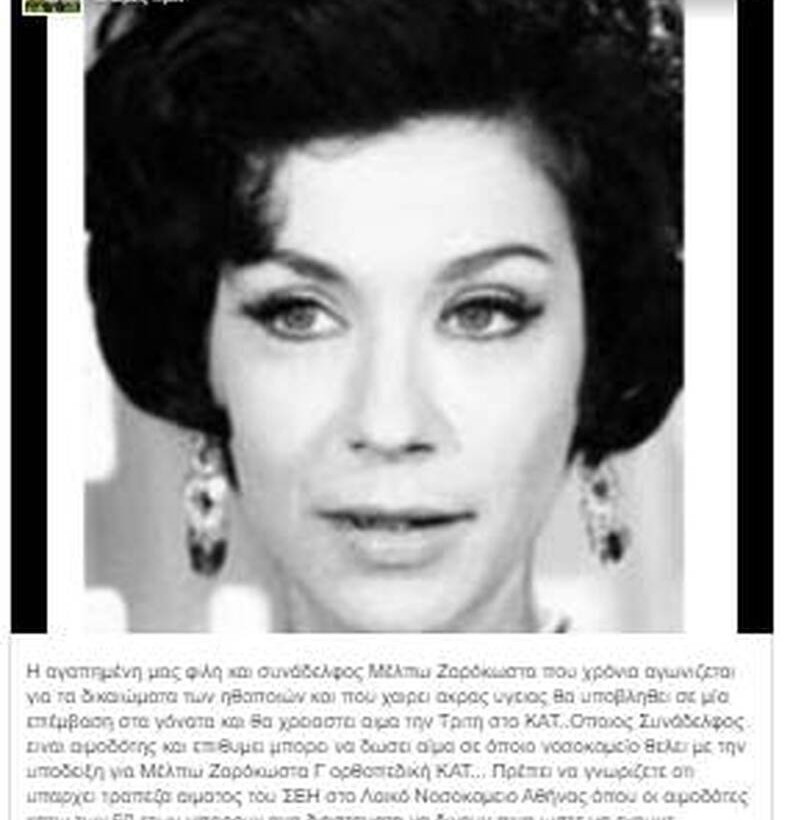 Ο ίδιος ανέφερε στη δημοσίευσή του: «Η αγαπημένη μας φίλη και συνάδελφος Μέλπω Ζαρόκωστα που χρόνια αγωνίζεται για τα δικαιώματα των ηθοποιών και που χαίρει άκρας υγείας θα υποβληθεί σε μία επέμβαση στα γόνατα και θα χρειαστεί αίμα την Τρίτη στο ΚΑΤ. Όποιος Συνάδελφος είναι αιμοδότης και επιθυμεί μπορεί να δώσει αίμα σε όποιο νοσοκομείο θέλει με την υπόδειξη για Μέλπω Ζαρόκωστα Γ’ Ορθοπεδική ΚΑΤ… Πρέπει να γνωρίζετε ότι υπάρχει τράπεζα αίματος του ΣΕΗ στο Λαϊκό Νοσοκομείο Αθήνας όπου οι αιμοδότες κάτω των 60 ετών μπορούν ανά διαστήματα να δίνουν αίμα ώστε να έχουμε επάρκεια για τους συναδέλφους μας κατ’ αρχάς».
