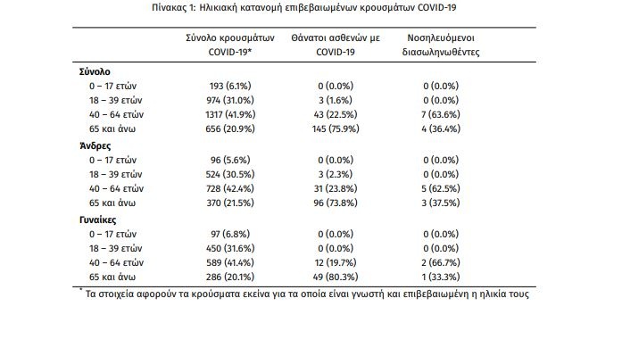 Η μέση ηλικία των κρουσμάτων είναι 47 έτη (εύρος 0 έως 102 ετών), ενώ η μέση ηλικία των θανάτων είναι 76 έτη (εύρος 35 έως 102 ετών). Η ηλικιακή κατανομή των (α) συνολικών κρουσμάτων, (β) των περιστατικών που κατέληξαν σε θάνατο και (γ) των ασθενών που νοσηλεύονται διασωληνωμένοι, είναι η ακόλουθη: