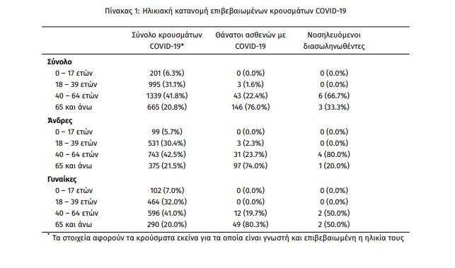 Τέλος, δεν έχει καταγραφεί κανένας νέος θάνατος ενώ έχουμε 192 θανάτους συνολικά στη χώρα, εκ των οποίων οι 61 (31.8%) είναι γυναίκες και οι υπόλοιποι άνδρες. Η διάμεση ηλικία των θανόντων συμπολιτών μας ήταν τα 76 έτη και το 95.8% είχε κάποιο υποκείμενο νόσημα ή/και ηλικία 70 ετών και άνω.