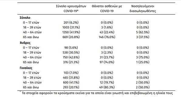 Τέλος, δεν έχει καταγραφεί κανένας νέος θάνατος ενώ έχουμε 192 θανάτους συνολικά στη χώρα. Οι 61 (31.8%) είναι γυναίκες και οι υπόλοιποι άνδρες. Η διάμεση ηλικία των θανόντων συμπολιτών μας ήταν τα 76 έτη και το 95.8% είχε κάποιο υποκείμενο νόσημα ή/και ηλικία 70 ετών και άνω.