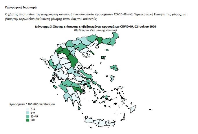 Ο χάρτης αποτυπώνει τη γεωγραφική κατανομή των συνολικών κρουσμάτων COVID-19 ανά Περιφερειακή Ενότητα της χώρας, με βάση την δηλωθείσα διεύθυνση μόνιμης κατοικίας του ασθενούς.
