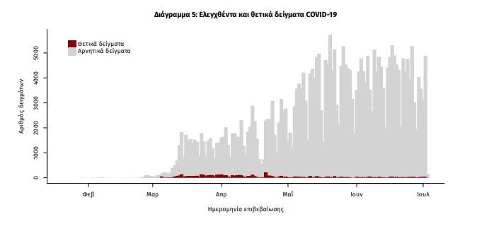 Δείγματα που έχουν ελεγχθεί στα συνεργαζόμενα με τον ΕΟΔΥ εργαστήρια: Από την 1η Ιανουαρίου 2020 μέχρι σήμερα, στα εργαστήρια που διενεργούν ελέγχους για τον νέο κορωνοϊό (SARS-CoV-2) και που δηλώνουν συστηματικά στον ΕΟΔΥ το σύνολο των δειγμάτων που ελέγχουν (θετικά και αρνητικά), έχουν συνολικά ελεγχθεί 308.392 κλινικά δείγματα, εκ των οποίων τα 5.478 (1.8%) ήταν θετικά στον κορονοϊό (συμπεριλαμβάνονται και περισσότερα από ένα δείγματα ανά άτομο που ελέγχθηκε).