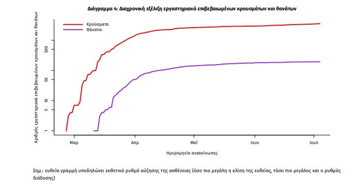 Η διαχρονική εξέλιξη των συνολικών κρουσμάτων και συνολικού αριθμού των θανάτων ασθενών COVID-19 παρουσιάζεται στο ακόλουθο διάγραμμα (σε λογαριθμική κλίμακα).