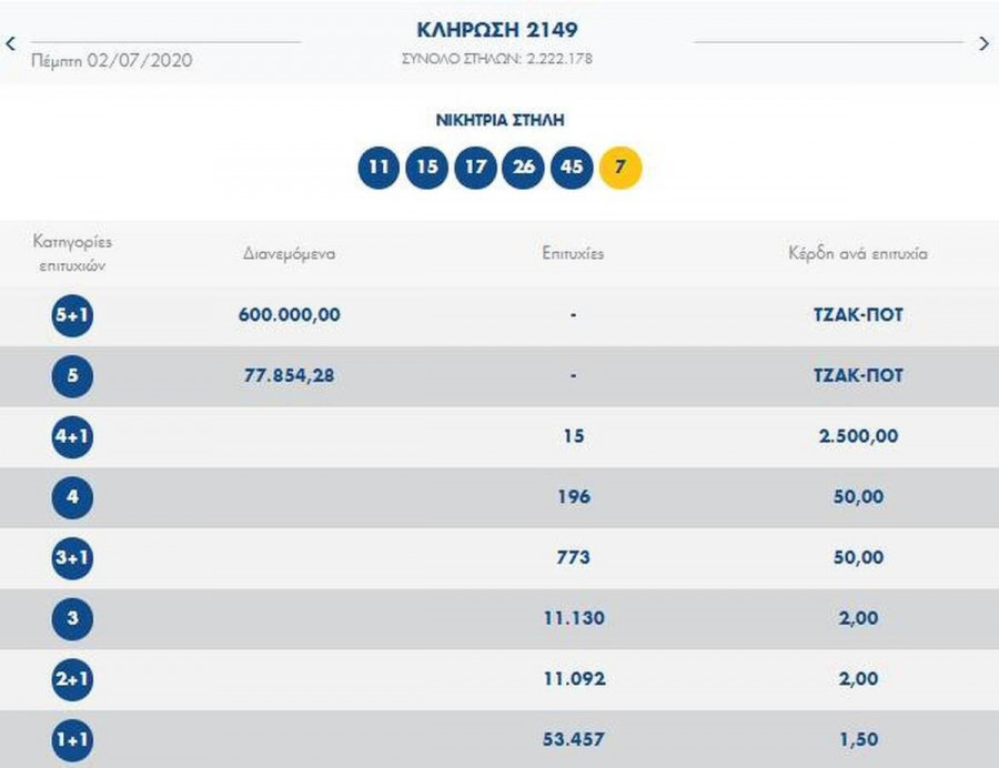 Υπενθυμίζεται ότι οι τυχεροί αριθμοί που ανέδειξε η κληρωτίδα στην περασμένη κλήρωση ήταν οι: 11, 15, 17, 26, 45 και Τζόκερ ο αριθμός 7.