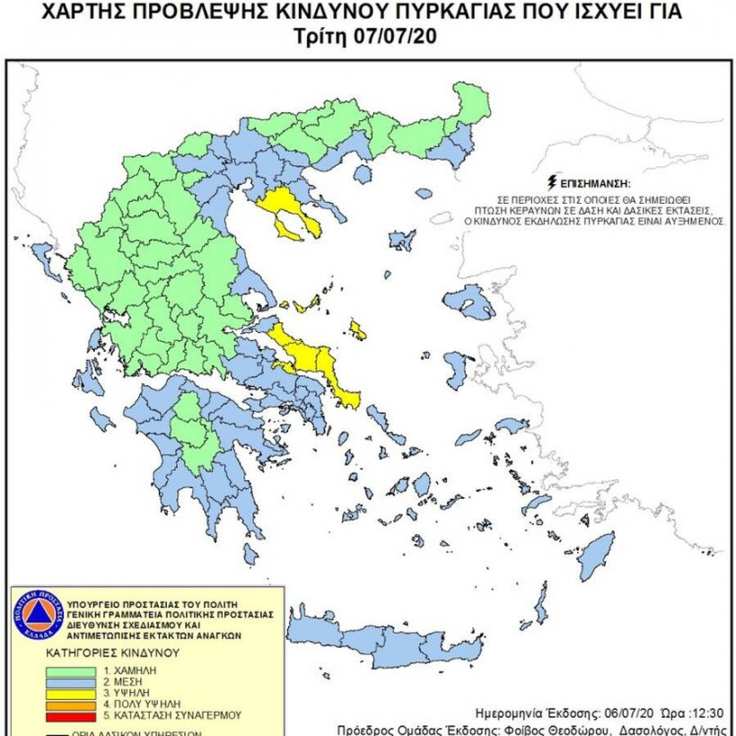Φωτιές στην Ελλάδα - Όλες οι ειδήσεις: Σύμφωνα με το Χάρτη Πρόβλεψης Κινδύνου Πυρκαγιάς που εκδίδει η Γενική Γραμματεία Πολιτικής Προστασίας του Υπουργείου Εσωτερικών και Διοικητικής Ανασυγκρότησης, για σήμερα Τρίτη, 7 Ιουλίου, προβλέπεται υψηλός κίνδυνος πυρκαγιάς (κατηγορία κινδύνου 3), σε ορισμένες περιοχές της Ελλάδας.