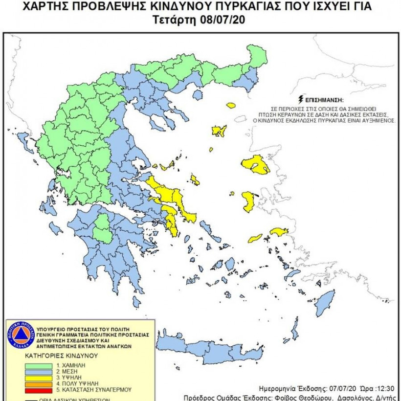 Φωτιές στην Ελλάδα - Όλες οι ειδήσεις: Σύμφωνα με το Χάρτη Πρόβλεψης Κινδύνου Πυρκαγιάς που εκδίδει η Γενική Γραμματεία Πολιτικής Προστασίας του Υπουργείου Εσωτερικών και Διοικητικής Ανασυγκρότησης, για σήμερα Τετάρτη, 8 Ιουλίου, προβλέπεται υψηλός κίνδυνος πυρκαγιάς (κατηγορία κινδύνου 3), σε ορισμένες περιοχές της Ελλάδας.