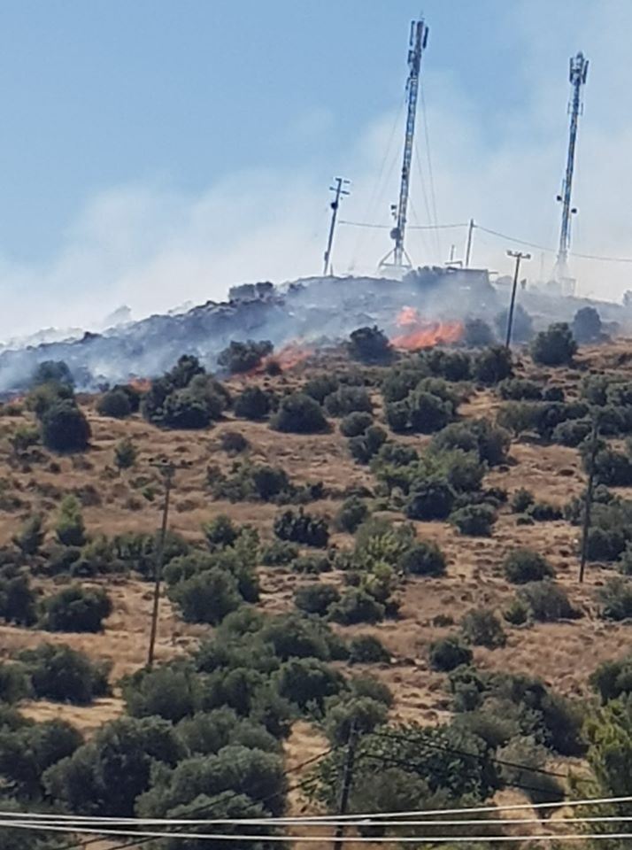 Σύμφωνα με την ενημέρωση του γραφείου Τύπου η φωτιά καίει χαμηλή βλάστηση και ξερά χόρτα και δεν κινδυνεύουν κατοικίες.