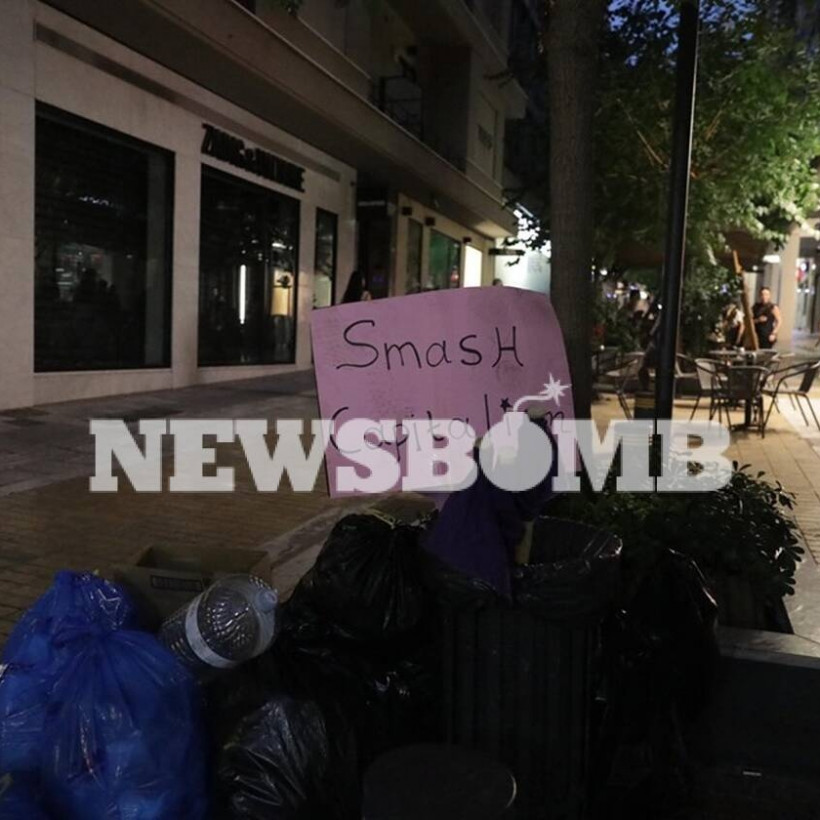 Σπασμένα μάρμαρα, συνθήματα σε κάθε ελεύθερη επιφάνεια και καταστροφές. Αυτά τα στοιχεία συνθέτουν την εικόνα του κέντρου της Αθήνας μετά τις συγκεντρώσεις και την πορεία για το νομοσχέδιο για τις διαδηλώσεις.