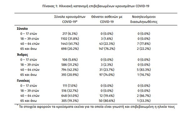Η μέση ηλικία των κρουσμάτων είναι 47 έτη (εύρος 0 έως 102 ετών), ενώ η μέση ηλικία των θανάτων είναι 76 έτη (εύρος 35 έως 102 ετών). Η ηλικιακή κατανομή των (α) συνολικών κρουσμάτων, (β) των περιστατικών που κατέληξαν σε θάνατο και (γ) των ασθενών που νοσηλεύονται διασωληνωμένοι, είναι η ακόλουθη: