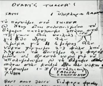 Σε ένα χειρόγραφο σημείωμα που είχε δώσει σε ασθενή με όγκο στις ωοθήκες, ανέφερε: «Παίρνουμε 2-3 φύλλα από λάχανο, τα βουτάμε 2-3 φορές μέσα σε βραστό νερό για να απολυμάνουμε και τα βάζουμε επάνω στην κοιλιά για όλη τη νύχτα».