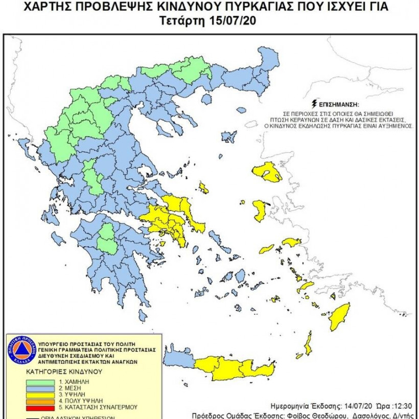 Φωτιές στην Ελλάδα - Όλες οι ειδήσεις: Σύμφωνα με το Χάρτη Πρόβλεψης Κινδύνου Πυρκαγιάς που εκδίδει η Γενική Γραμματεία Πολιτικής Προστασίας του Υπουργείου Εσωτερικών και Διοικητικής Ανασυγκρότησης, για σήμερα Τετάρτη, 15 Ιουλίου, προβλέπεται υψηλός κίνδυνος πυρκαγιάς (κατηγορία κινδύνου 3), σε ορισμένες περιοχές της Ελλάδας.