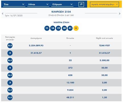 Υπενθυμίζεται ότι χθες, οι τυχεροί αριθμοί που ανέδειξε η κληρωτίδα ήταν οι: 11, 16, 19, 30, 41 και Τζόκερ ο αριθμός 6.