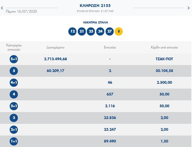 Οι τυχεροί αριθμοί που ανέδειξε η κληρωτίδα της αποψινής κλήρωσης ήταν οι: 12, 21, 23, 24, 27 και Τζόκερ το 8.