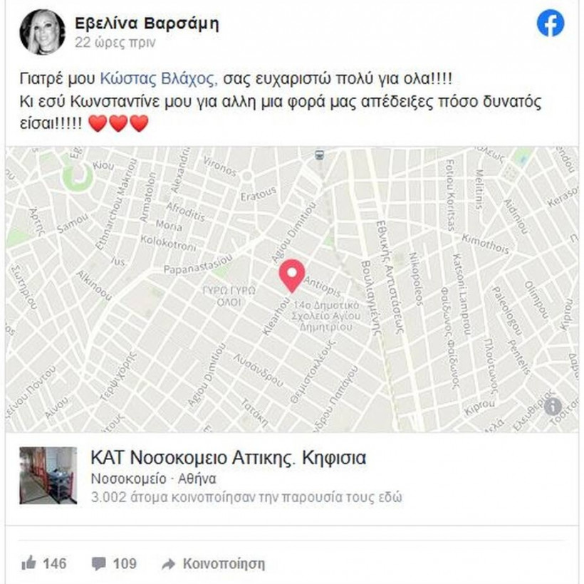 Η σύζυγός του, Εβελίνα Βαρσαμή, πόσταρε μία συγκινητική φωτογραφία στην οποία απεικονίζεται να του κρατά το χέρι και έγραψε ότι βρίσκονται στο νοσοκομείο ΚΑΤ, όπου υποβλήθηκε σε ένα κρίσιμο χειρουργείο.