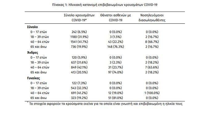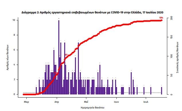Τέλος, έχουμε έναν ακόμα καταγεγραμμένο θάνατο και 194 θανάτους συνολικά στη χώρα. Οι 63 (32.5%) είναι γυναίκες και οι υπόλοιποι άνδρες. Η διάμεση ηλικία των θανόντων συμπολιτών μας ήταν τα 76 έτη και το 95.9% είχε κάποιο υποκείμενο νόσημα ή/και ηλικία 70 ετών και άνω.