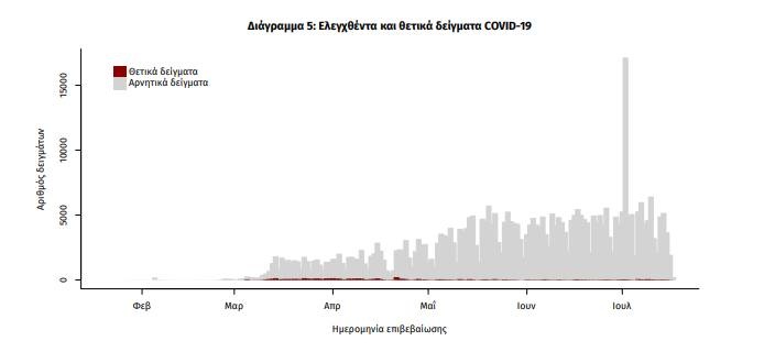 Δείγματα που έχουν ελεγχθεί στα συνεργαζόμενα με τον ΕΟΔΥ εργαστήρια: Από την 1η Ιανουαρίου 2020 μέχρι σήμερα, στα εργαστήρια που διενεργούν ελέγχους για τον νέο κορoνοϊό (SARS-CoV-2) και που δηλώνουν συστηματικά στον ΕΟΔΥ το σύνολο των δειγμάτων που ελέγχουν (θετικά και αρνητικά), έχουν συνολικά ελεγχθεί 402.672 κλινικά δείγματα, εκ των οποίων τα 6.120 (1.5%) ήταν θετικά στον κορoνοϊό (συμπεριλαμβάνονται και περισσότερα από ένα δείγματα ανά άτομο που ελέγχθηκε).