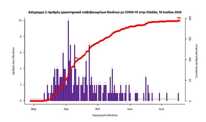 Τέλος, δεν έχει καταγραφεί κανένας νέος θάνατος ενώ έχουμε 194 θανάτους συνολικά στη χώρα. Οι 63 (32.5%) γυναίκες και οι υπόλοιποι άνδρες. Η διάμεση ηλικία των θανόντων συμπολιτών μας ήταν τα 76 έτη και το 95.9% είχε κάποιο υποκείμενο νόσημα ή/και ηλικία 70 ετών και άνω.