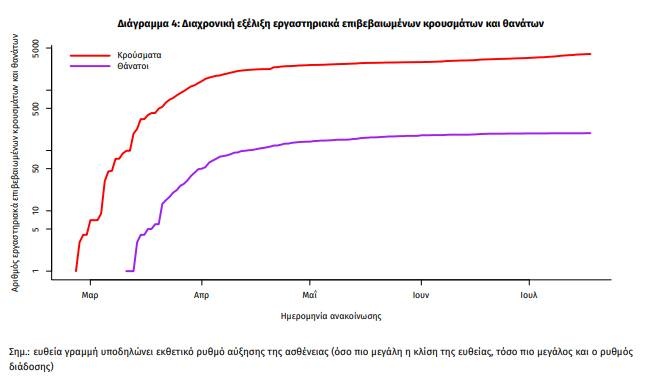 Η διαχρονική εξέλιξη των συνολικών κρουσμάτων και συνολικού αριθμού των θανάτων ασθενών COVID-19 παρουσιάζεται στο ακόλουθο διάγραμμα (σε λογαριθμική κλίμακα).