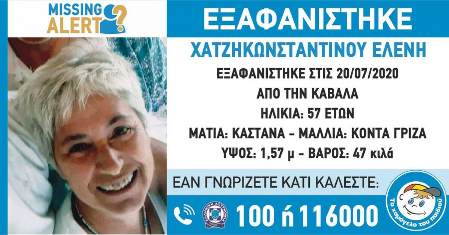 Πρόκειται για την 57χρονη Ελένη Χατζηκωνσταντίνου, για την οποία έχει εκδοθεί Missing Alert από το Χαμόγελο του Παιδιού.