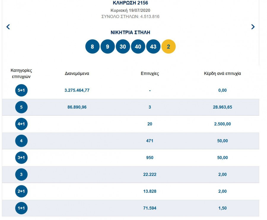 Υπενθυμίζεται ότι στην κυριακάτικη κλήρωση, οι τυχεροί αριθμοί που είχαν αναδειχθεί ήταν οι: 8, 9, 30, 40, 43 και Τζόκερ το 2.