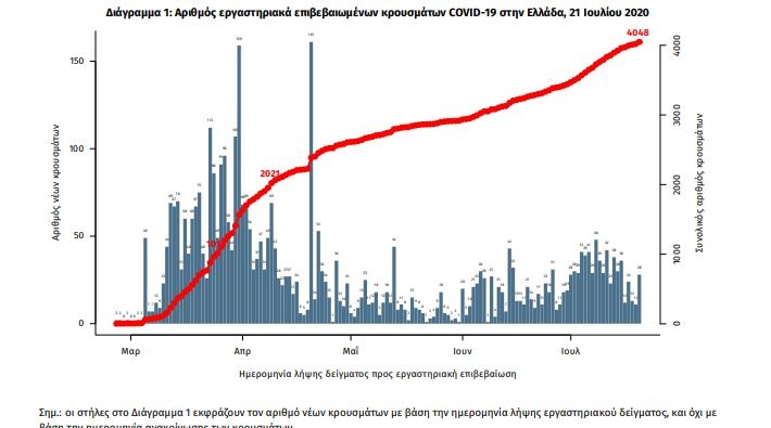 Η ημερήσια κατανομή των επιβεβαιωμένων κρουσμάτων είναι η ακόλουθη (η γραμμή παριστάνει την συνολική, αθροιστική κατανομή των κρουσμάτων).