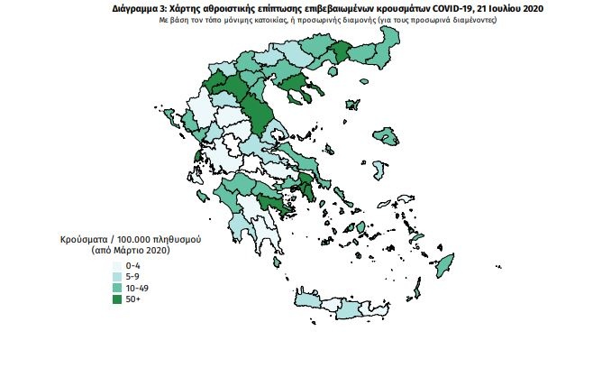 Ο χάρτης αποτυπώνει τη γεωγραφική κατανομή των συνολικών κρουσμάτων COVID-19 (από την αρχή της επιδημίας) ανά Περιφερειακή Ενότητα της χώρας, με βάση την δηλωθείσα διεύθυνση μόνιμης κατοικίας του ασθενούς, ή τη διεύθυνση προσωρινής διαμονής για τους τουρίστες και άλλους προσωρινά διαμένοντες στην Ελλάδα.