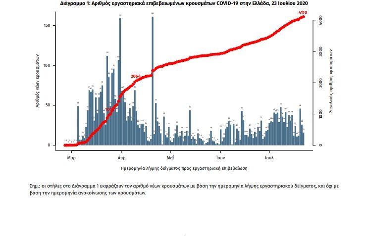Η ημερήσια κατανομή των επιβεβαιωμένων κρουσμάτων είναι η ακόλουθη (η γραμμή παριστάνει την συνολική, αθροιστική κατανομή των κρουσμάτων).