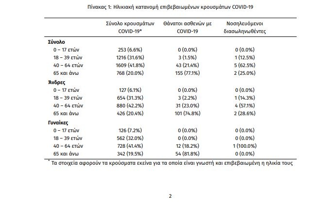Η μέση ηλικία των κρουσμάτων είναι 47 έτη (εύρος 0 έως 102 ετών), ενώ η μέση ηλικία των θανάτων είναι 76 έτη (εύρος 35 έως 102 ετών). Η ηλικιακή κατανομή των (α) συνολικών κρουσμάτων, (β) των περιστατικών που κατέληξαν σε θάνατο και (γ) των ασθενών που νοσηλεύονται διασωληνωμένοι, είναι η ακόλουθη:
