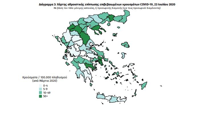 Ο χάρτης αποτυπώνει τη γεωγραφική κατανομή των συνολικών κρουσμάτων COVID-19 (από την αρχή της επιδημίας) ανά Περιφερειακή Ενότητα της χώρας, με βάση την δηλωθείσα διεύθυνση μόνιμης κατοικίας του ασθενούς, ή τη διεύθυνση προσωρινής διαμονής για τους τουρίστες και άλλους προσωρινά διαμένοντες στην Ελλάδα. Συμπεριλαμβάνονται τόσο κρούσματα με ιστορικό ταξιδίου (“εισαγόμενα”) όσο και κρούσματα με πιθανή εγχώρια μετάδοση.