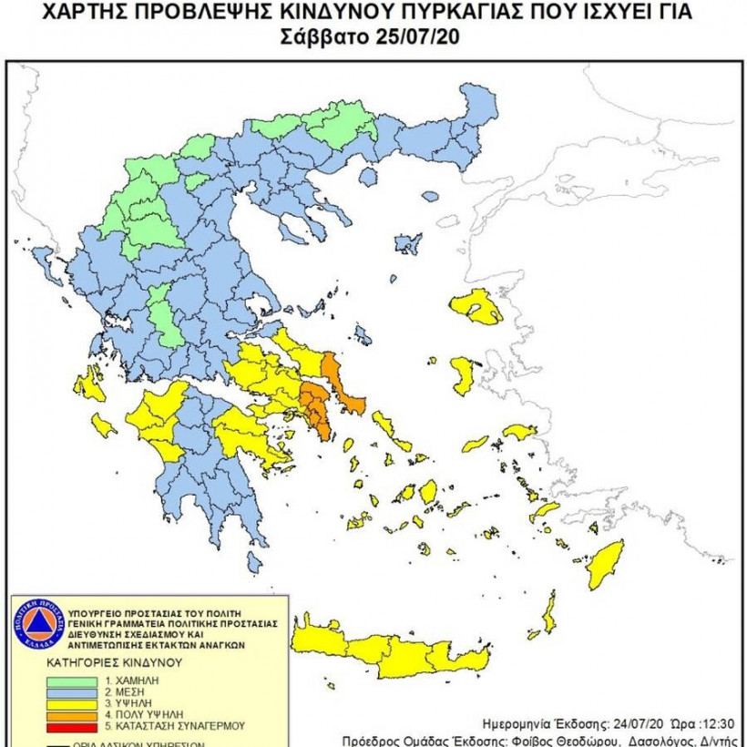 Ο κίνδυνος πυρκαγιάς παραμένει πολύ υψηλός και αύριο, Σάββατο 25 Ιουλίου, σε δύο περιφέρειες, σύμφωνα με τον χάρτη πρόβλεψης που εκδίδει η Γενική Γραμματεία Πολιτικής Προστασίας. Ειδικότερα, σε κατηγορία κινδύνου 4 βρίσκονται η Περιφέρεια Αττικής και η Περιφέρεια Στερεάς Ελλάδας (Περιφερειακή Ενότητα Ευβοίας).