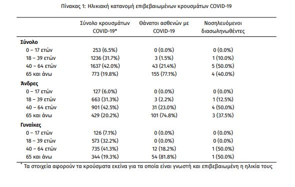 Η μέση ηλικία των κρουσμάτων είναι 47 έτη (εύρος 0 έως 102 ετών), ενώ η μέση ηλικία των θανάτων είναι 76 έτη (εύρος 35 έως 102 ετών). Η ηλικιακή κατανομή των (α) συνολικών κρουσμάτων, (β) των περιστατικών που κατέληξαν σε θάνατο και (γ) των ασθενών που νοσηλεύονται διασωληνωμένοι, είναι η ακόλουθη: