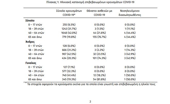 Η μέση ηλικία των κρουσμάτων είναι 47 έτη (εύρος 0 έως 102 ετών), ενώ η μέση ηλικία των θανάτων είναι 76 έτη (εύρος 35 έως 102 ετών). Η ηλικιακή κατανομή των (α) συνολικών κρουσμάτων, (β) των περιστατικών που κατέληξαν σε θάνατο και (γ) των ασθενών που νοσηλεύονται διασωληνωμένοι, είναι η ακόλουθη: