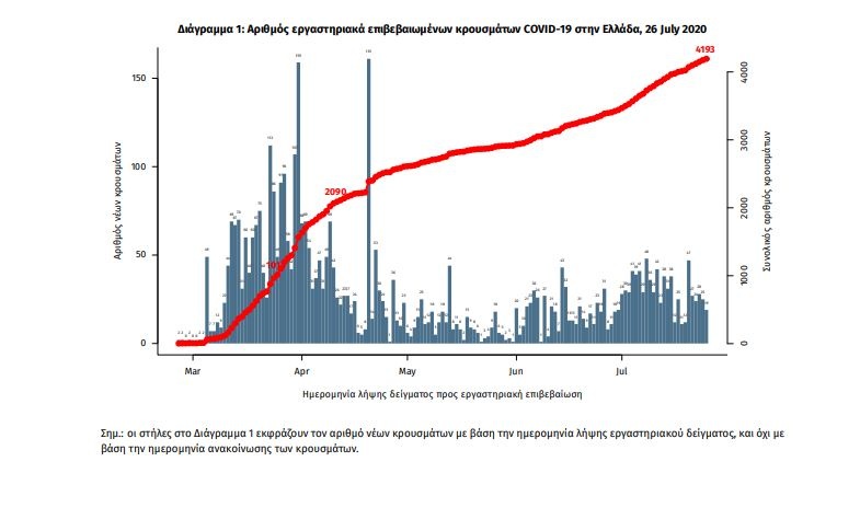 Τα νέα εργαστηριακά επιβεβαιωμένα κρούσματα της νόσου είναι 27, εκ των οποίων τα 4 εντοπίστηκαν κατόπιν ελέγχων στις πύλες εισόδου της χώρας.