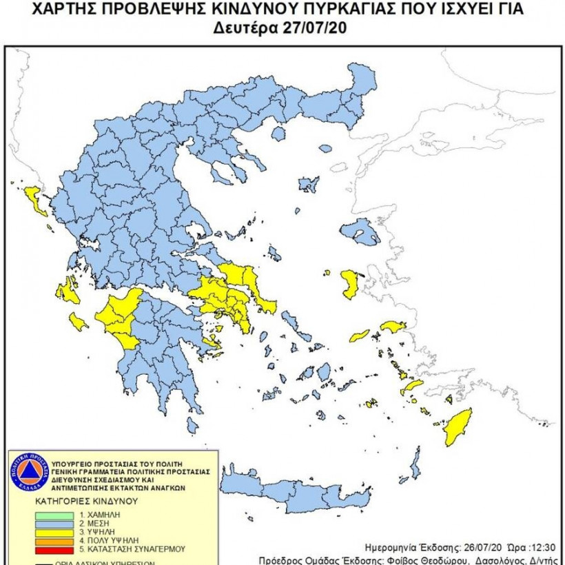 Φωτιές στην Ελλάδα - Όλες οι ειδήσεις: Σύμφωνα με το Χάρτη Πρόβλεψης Κινδύνου Πυρκαγιάς που εκδίδει η Γενική Γραμματεία Πολιτικής Προστασίας του Υπουργείου Εσωτερικών και Διοικητικής Ανασυγκρότησης, για σήμερα Δευτέρα, 27 Ιουλίου, προβλέπεται υψηλός κίνδυνος πυρκαγιάς (κατηγορία κινδύνου 3), σε ορισμένες περιοχές της Ελλάδας.