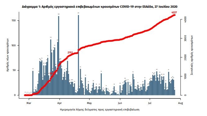 Τα νέα εργαστηριακά επιβεβαιωμένα κρούσματα της νόσου τη Δευτέρα (27/07) είναι 35, εκ των οποίων τα 4 εντοπίστηκαν κατόπιν ελέγχων στις πύλες εισόδου της χώρας.
