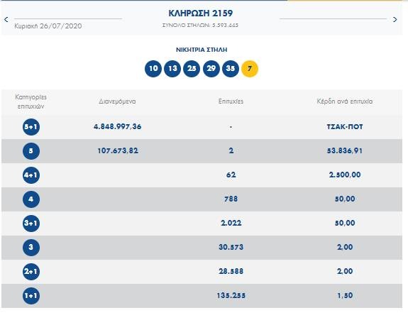 Αξίζει επίσης να σημειωθεί ότι στην δεύτερη κατηγορία (5αρια) βρέθηκαν δύο επιτυχημένα δελτία που κερδίζουν από 53.836,91 ευρώ το κάθε ένα!
