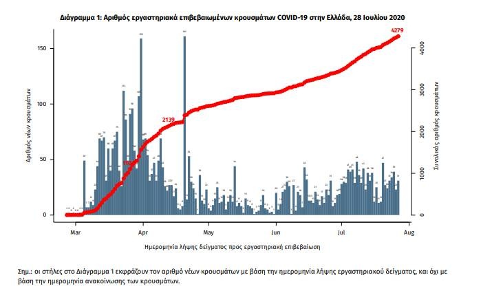 Τα νέα εργαστηριακά επιβεβαιωμένα κρούσματα της νόσου τη Τρίτη (28/07) είναι 52, εκ των οποίων τα 7 εντοπίστηκαν κατόπιν ελέγχων στις πύλες εισόδου της χώρας. Ο συνολικός αριθμός των κρουσμάτων είναι 4.279, εκ των οποίων το 54.5% αφορά άνδρες.