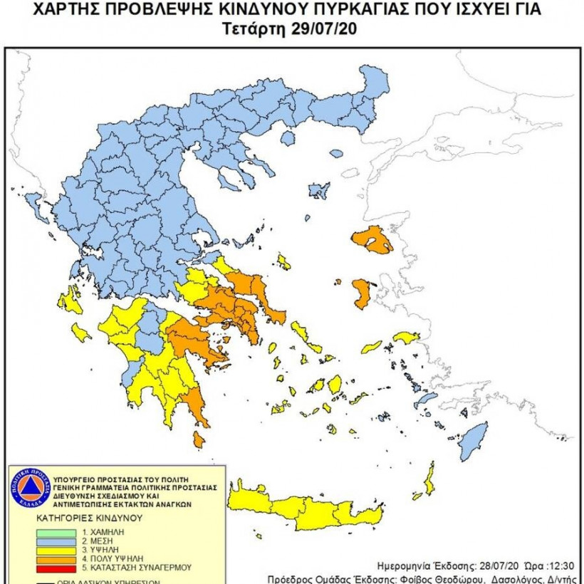 Σύμφωνα με το Χάρτη Πρόβλεψης Κινδύνου Πυρκαγιάς που εκδίδει η Γενική Γραμματεία Πολιτικής Προστασίας του Υπουργείου Εσωτερικών και Διοικητικής Ανασυγκρότησης, για σήμερα Τετάρτη, 29 Ιουλίου, προβλέπεται πολύ υψηλός κίνδυνος πυρκαγιάς (κατηγορία κινδύνου 4), σε ορισμένες περιοχές της Ελλάδας.
