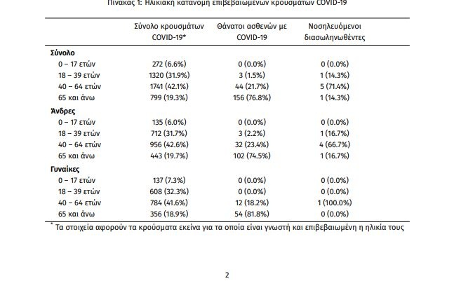 Η μέση ηλικία των κρουσμάτων είναι 46 έτη (εύρος 0 έως 102 ετών), ενώ η μέση ηλικία των θανάτων είναι 76 έτη (εύρος 35 έως 102 ετών). Η ηλικιακή κατανομή των (α) συνολικών κρουσμάτων, (β) των περιστατικών που κατέληξαν σε θάνατο και (γ) των ασθενών που νοσηλεύονται διασωληνωμένοι, είναι η ακόλουθη: