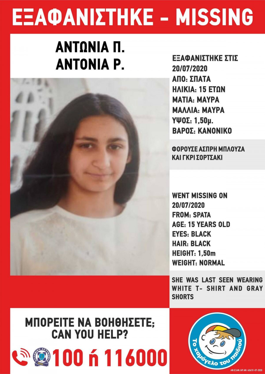 Το «Χαμόγελο του Παιδιού» ενημερώθηκε χθες, Πέμπτη (30/07) για την εξαφάνισή της Αντωνίας Π. και προχώρησε σήμερα στη δημοσιοποίηση των στοιχείων της ανήλικης κατόπιν αιτήματος του συγγενικού της περιβάλλοντος.