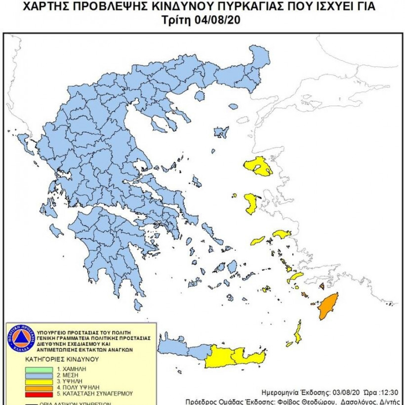 Σύμφωνα με το Χάρτη Πρόβλεψης Κινδύνου Πυρκαγιάς που εκδίδει η Γενική Γραμματεία Πολιτικής Προστασίας του Υπουργείου Προστασίας του Πολίτη (www.civilprotection.gr), για σήμερα, Τρίτη 4 Αυγούστου 2020, προβλέπεται πολύ υψηλός κίνδυνος πυρκαγιάς (κατηγορία κινδύνου 4) για τις εξής περιοχές: